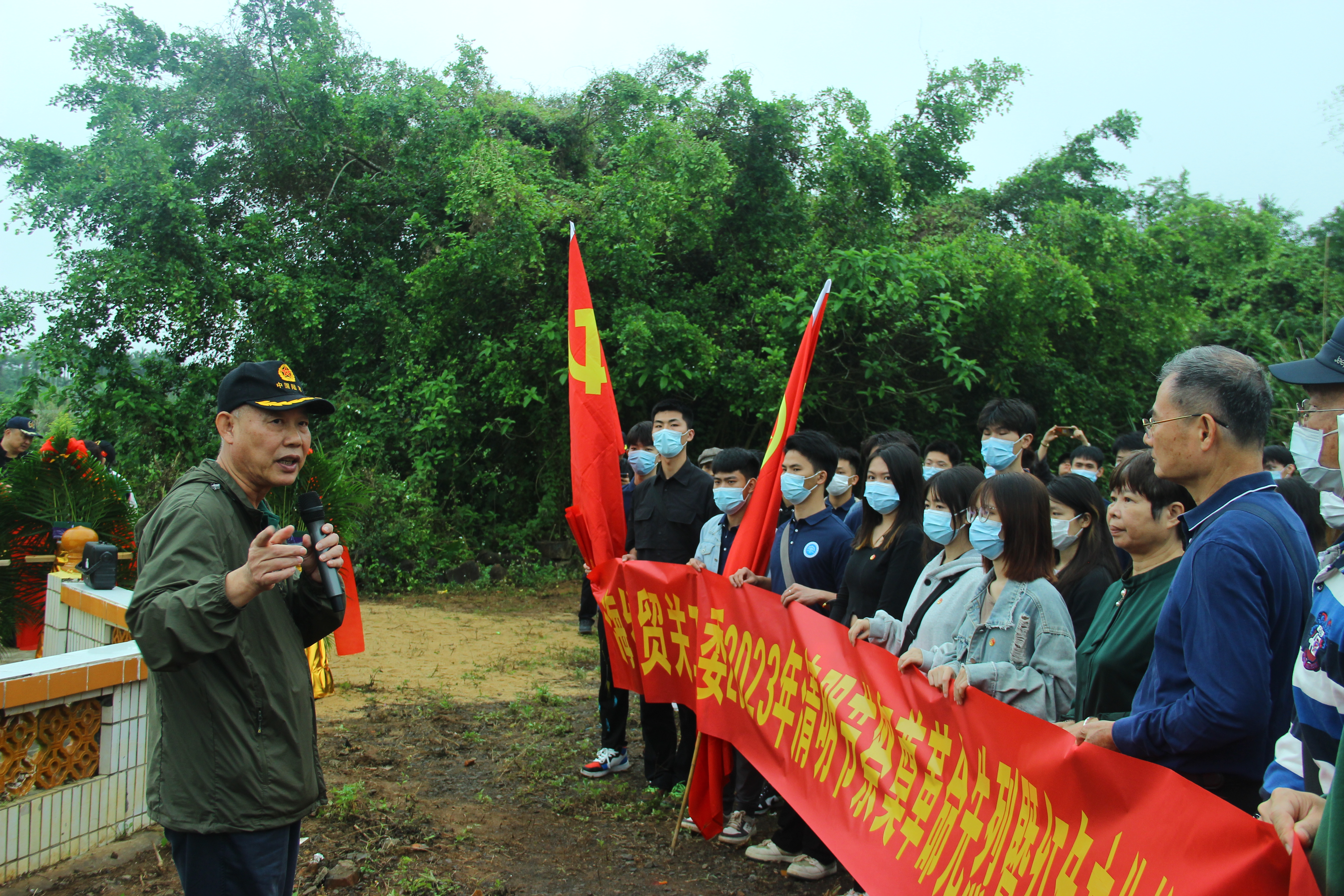 升旗活动结束后,学生党支部一行人步行前往了黄竹小学附近附近的无名烈士墓,进行祭奠活动。在无名革命烈墓前,大家有序向先烈敬献鲜花,深情鞠躬,默哀,哀悼亡故英灵。随后,四野后代、美亭大决战研究会会长傅清扬老政委在活动现场,为大家详细讲述了解放海南战役美亭大决战的历史过往,通过战役中一个个激烈的战斗典型故事,以讲故事的方式带领同学们全面回顾了中国共产党的百年历史,就是领导和团结全国各族人民从救国、建国、富国到强国的奋斗历程,让学生们更直观地感受党的艰苦岁月和峥嵘历程。
