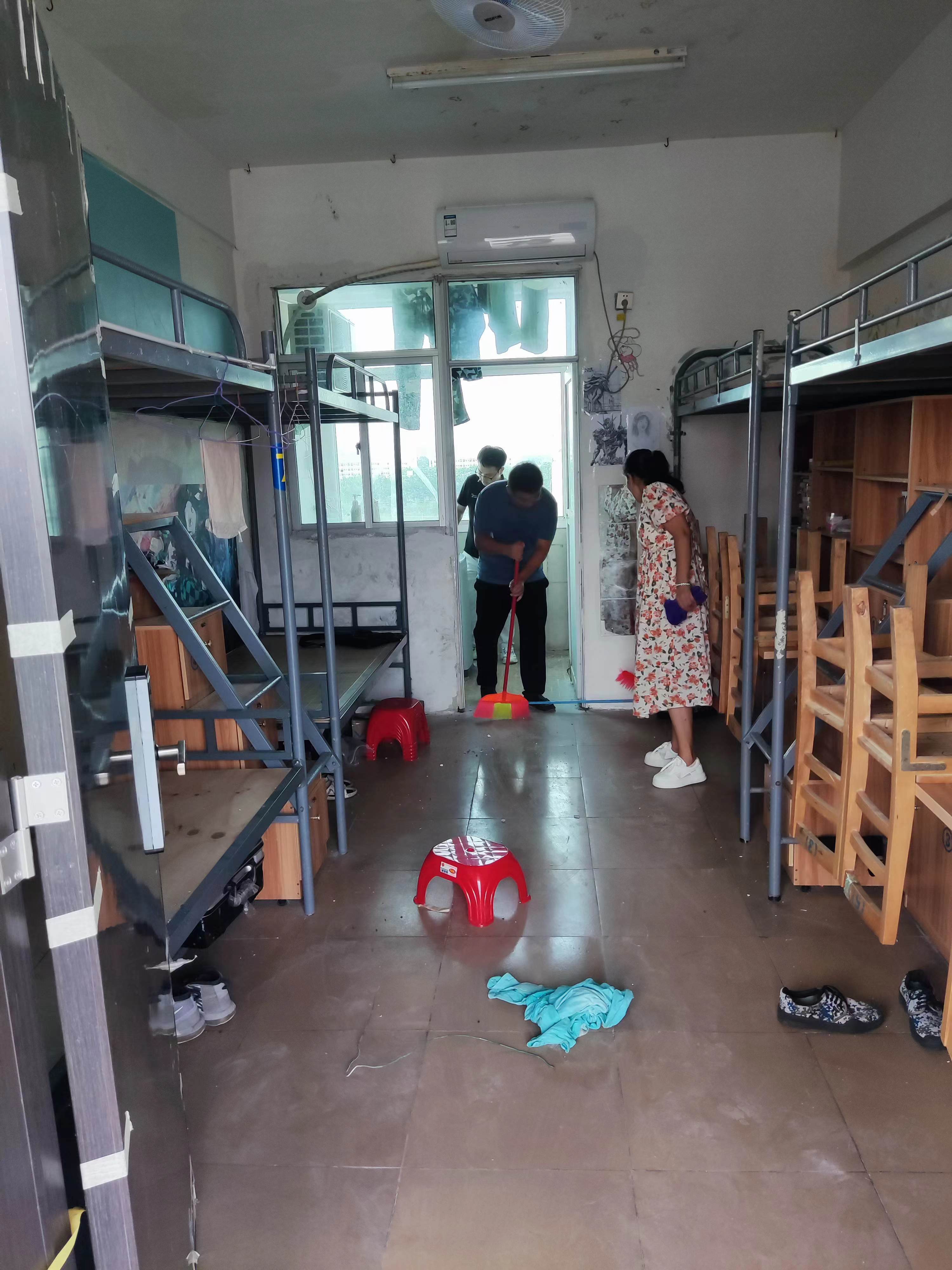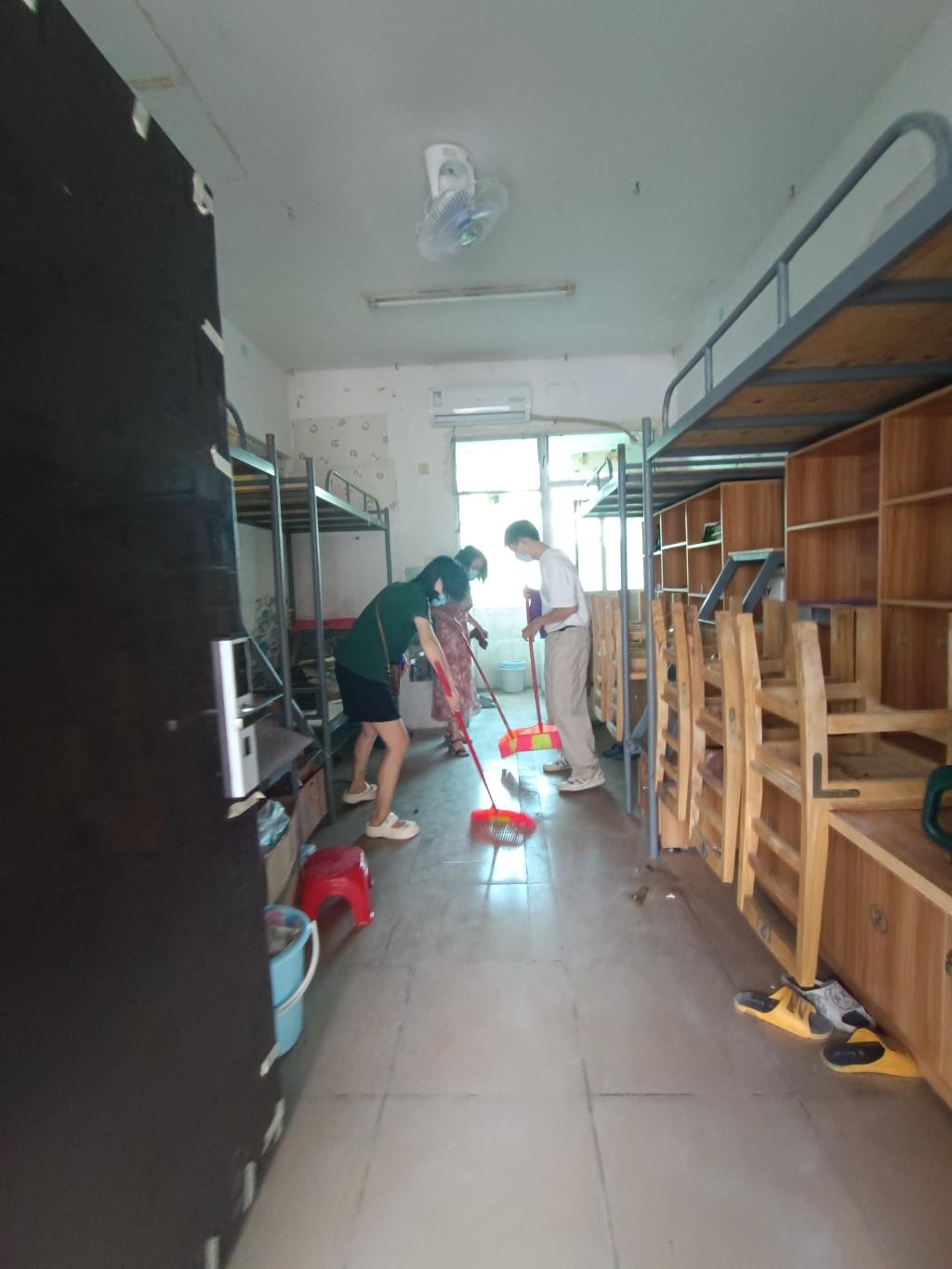 “没关系我来!”,“快快快,这边又有需要扔掉的垃圾!”、“这样孩子们住着就舒服多了!”。老师们分工明确、配合密切,在打扫过程中你一言我一语地相互鼓舞着,清除宿舍垃圾,将地面、桌面、家具等清洁干净。从阳台到洗手间,从书桌到床铺,对房间里的每一个细节都进行了仔细打扫,宿舍焕然一新。