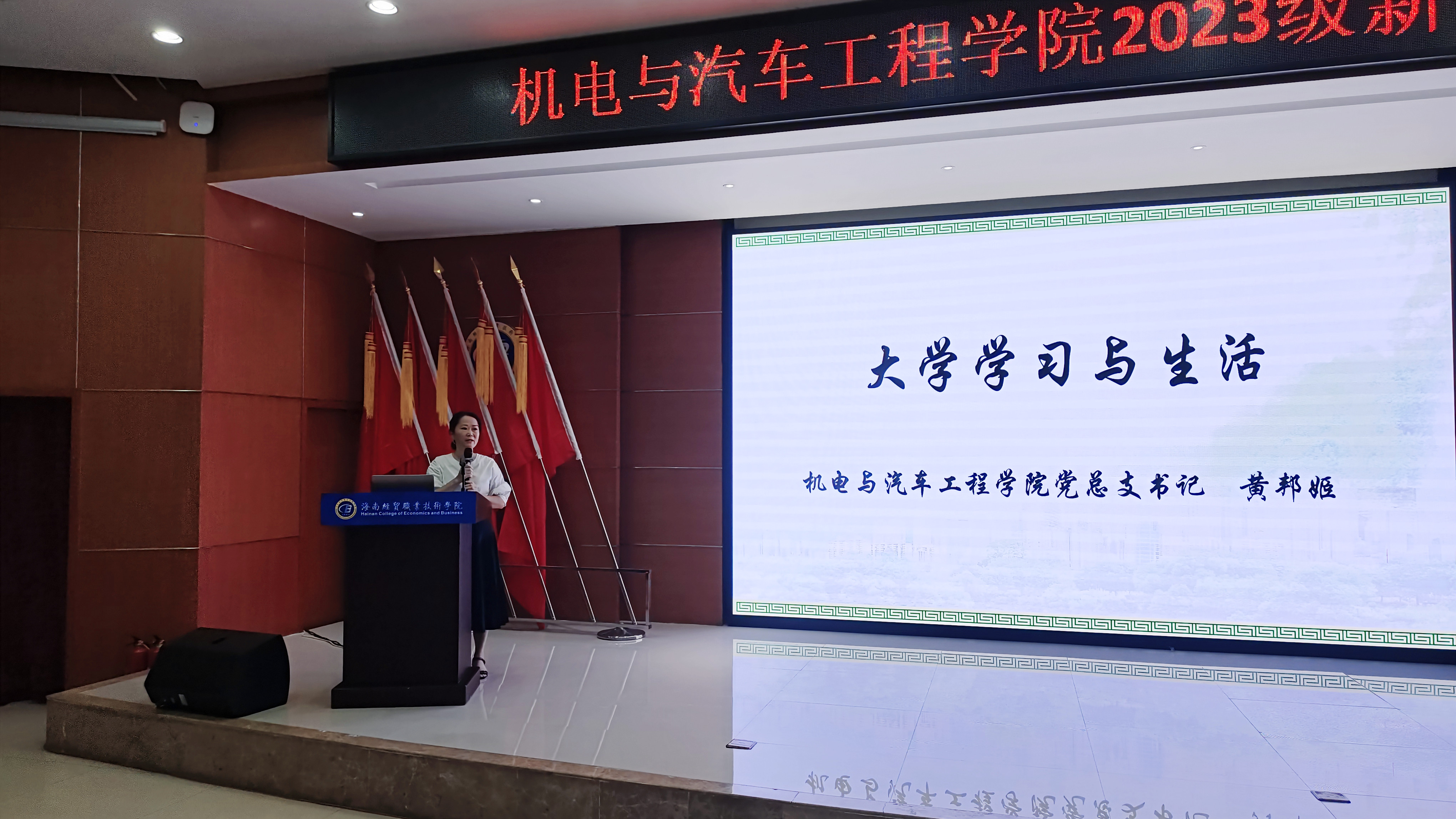 黄邦姬为新生讲授题“开学第一课——大学学习与生活”专题讲座,希望同学们尽早适应大学生活,尽早历练自己的职业素质,尽早做好大学学习与生活规划。她从身心素质、职业道德素质、行政技能素质、领导技能素质、职业技能素质等内容方面,引导同学们科学合理地制定大学三年规划,每学期小目标和每天作息安排。