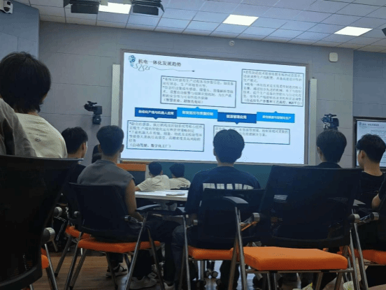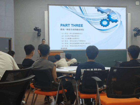 机电一体化技术专业负责人陈明老师就机电行业的发展、专业应用领域、就业情况进行了深入浅出的讲解,让学生更好地了解本专业的学习内容、市场应用情况、未来发展趋势,为大学生活和学习确定目标。