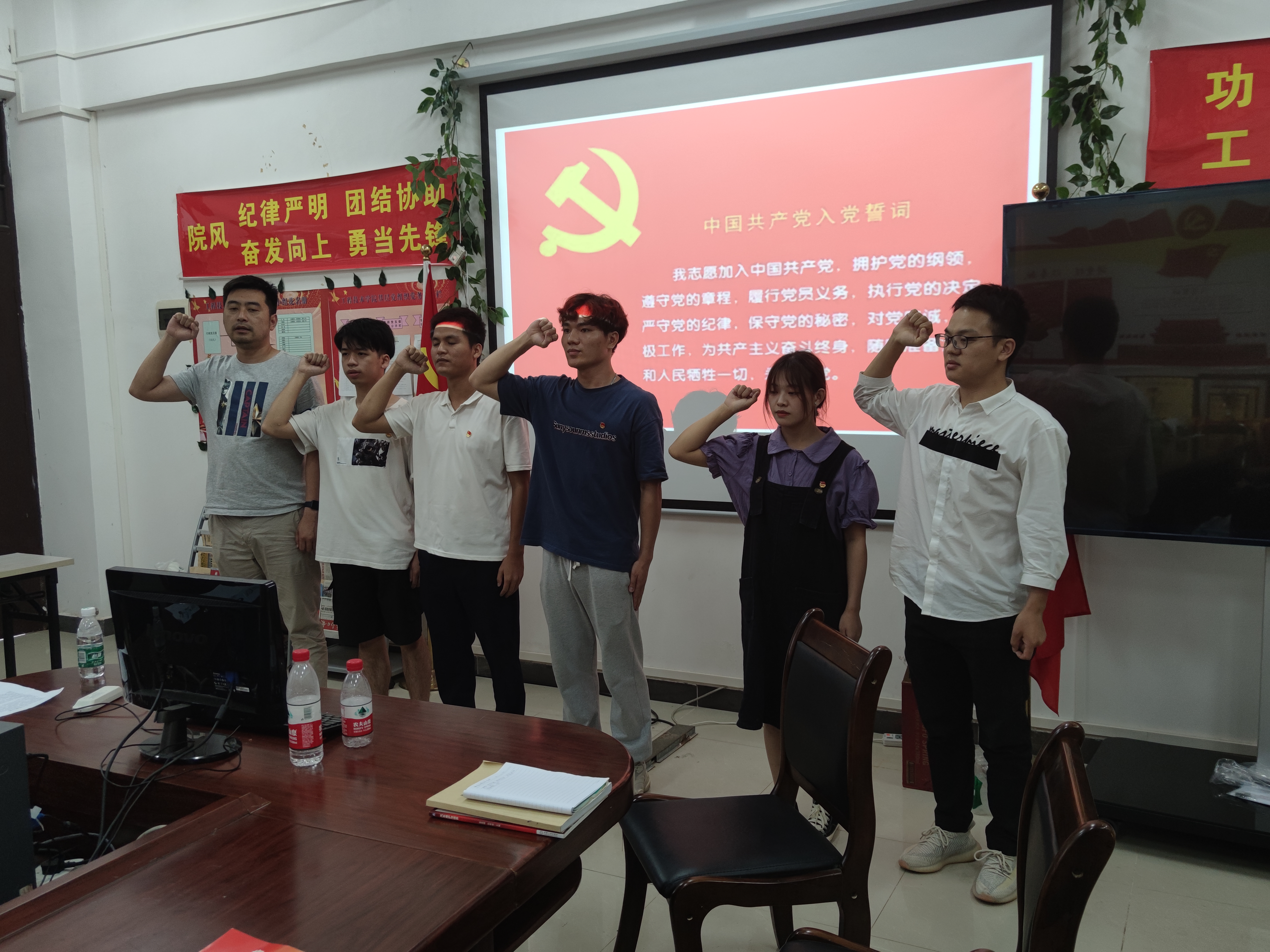 预备党员与支部书记以及支部委员共同在党旗下进行庄严的入党誓词宣誓,预备党员纷纷表达了自身的想法与决心,不忘初心跟党走,在今后的学习工作中,坚定目标、严格要求自身,努力改正现有不足。